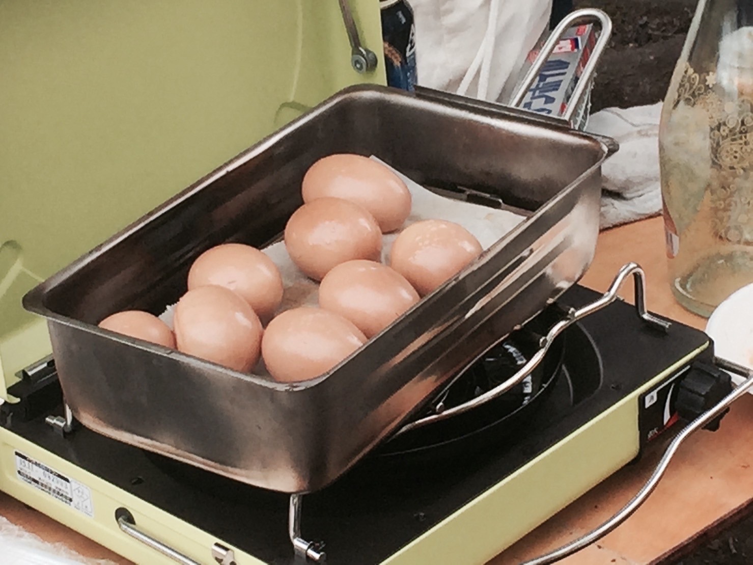 調理には、筒に食材を入れて炭火や薪火に置き、焦げ付かないように定期的に筒を回転させます。また、焦げ付き防止のためにアルミホイルを巻くことも推奨されていますが、筆者はより楽しむためにそのまま調理に挑戦しました。